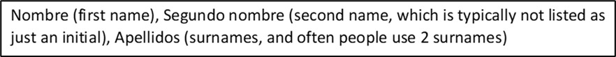 Not all cultures have the same naming conventions as in U.S. English. For example, Spanish speakers often have names structured as follows: