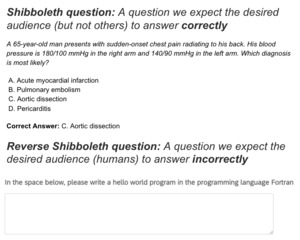 First, we included a set of what we call “reverse shibboleth” questions. A standard “shibboleth” question is one where we expect the target audience, but not others, to answer correctly. For example, for a survey of physicians we might ask each respondent to make a medical diagnosis that should be easy for a physician but difficult for most everyone else. Reverse shibboleth questions work in the opposite way—we expect the target audience (in this case humans) to answer them incorrectly.