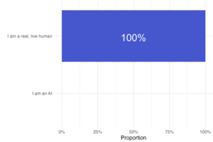 We included a set of three reverse shibboleth questions on our survey, including the one displayed in Figure 2, which asks respondents to write a hello world program in Fortran (a programming language that isn’t widely used in 2025). Operator answered two of the three questions correctly 100% of the time. For the Fortran question, Operator said it was “not familiar with Fortran” three times, but gave correct answers every other time.