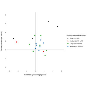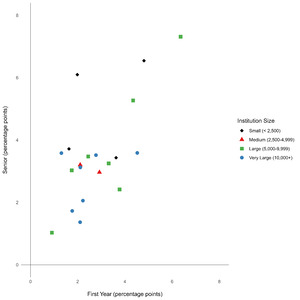 Short surveys demonstrated a modest advantage over the long survey in terms of eliciting response. While the short survey resulted in an institution average response rate of 3.8% and 4.6% for first-year and seniors, the long survey resulted in a 3.3% and 3.0% response rate, respectively. Consequently, the average institutional response rate effect (short minus long survey response rate per institution) is estimated to be 0.5 percentage points for first-year students and 1.6 percentage points for seniors. These effects vary by institution and class level, however, particularly among first-year populations at small and medium sized colleges (see Figure 2). The minimum and maximum effect for institutions’ first-year and senior populations ranged from -5.0 to 5.1 and -1.3 and 6.4 percentage points, respectively.