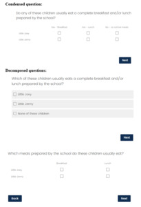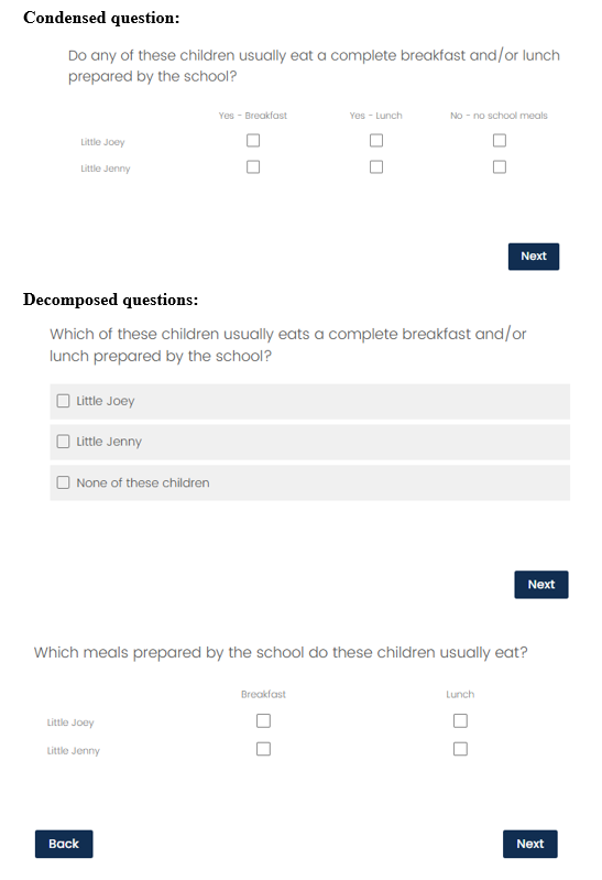 The decomposed version of the lunch question is still a grid, and it could have been decomposed even further, resulting in three (or more) questions in total. Given the time to read the additional question(s) and advance to the next screen(s), a more decomposed lunch question would probably not be more efficient than the condensed version. In addition, given the simplicity of the topic (school meals) and the limited number of response options (essentially a Yes/No for two meals), it seems unnecessary to decompose the question further. Depending on how different respondents prefer to recall this information (i.e., focusing on the child or the meal), they either need to see both meals on the screen for the child they are thinking about, or all children listed for a particular meal. The format tested provides the desired cross-section for both preferences. Separating either the children or the meals into additional questions would cause additional cognitive burden, undermining the goal of decomposing the question. Furthermore, separately asking about breakfast and lunch may introduce a confusing repetitiveness which could lead to measurement error or breakoff. While this experiment did not test this type of further decomposed question, even without empirical evidence, I caution against excessive question decomposition.