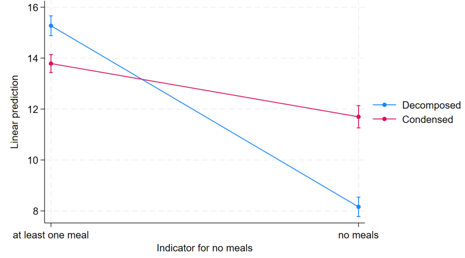 The speed of the decomposed question was also evident in the regression analyses of the reduced and full models showing only main effects. Before introducing the indicator for no meals selected (see Table 2, Models 1-3), respondents to the decomposed version were roughly one second faster to respond compared to those who answered the condensed question (e.g., β = -1.29; p < 0.001 for the full model with an indicator for only one child under 18 (Model 3)), on average, even after controlling for other characteristics.