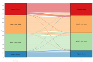 Attending to the magnitude of change, most changes were not drastic—typically shifting by only one category and toward greater restrictions. However, it is notable that among participants who shifted their answers by two or three categories, shifts from illegality to legality were more common than the reverse. In other words, the percentage of participants who initially answered illegal in all cases and shifted to legal in all/most cases (6.2%) was higher than those who began with legal in all cases and shifted to illegal in all/most cases (5.4%) (Table 1).