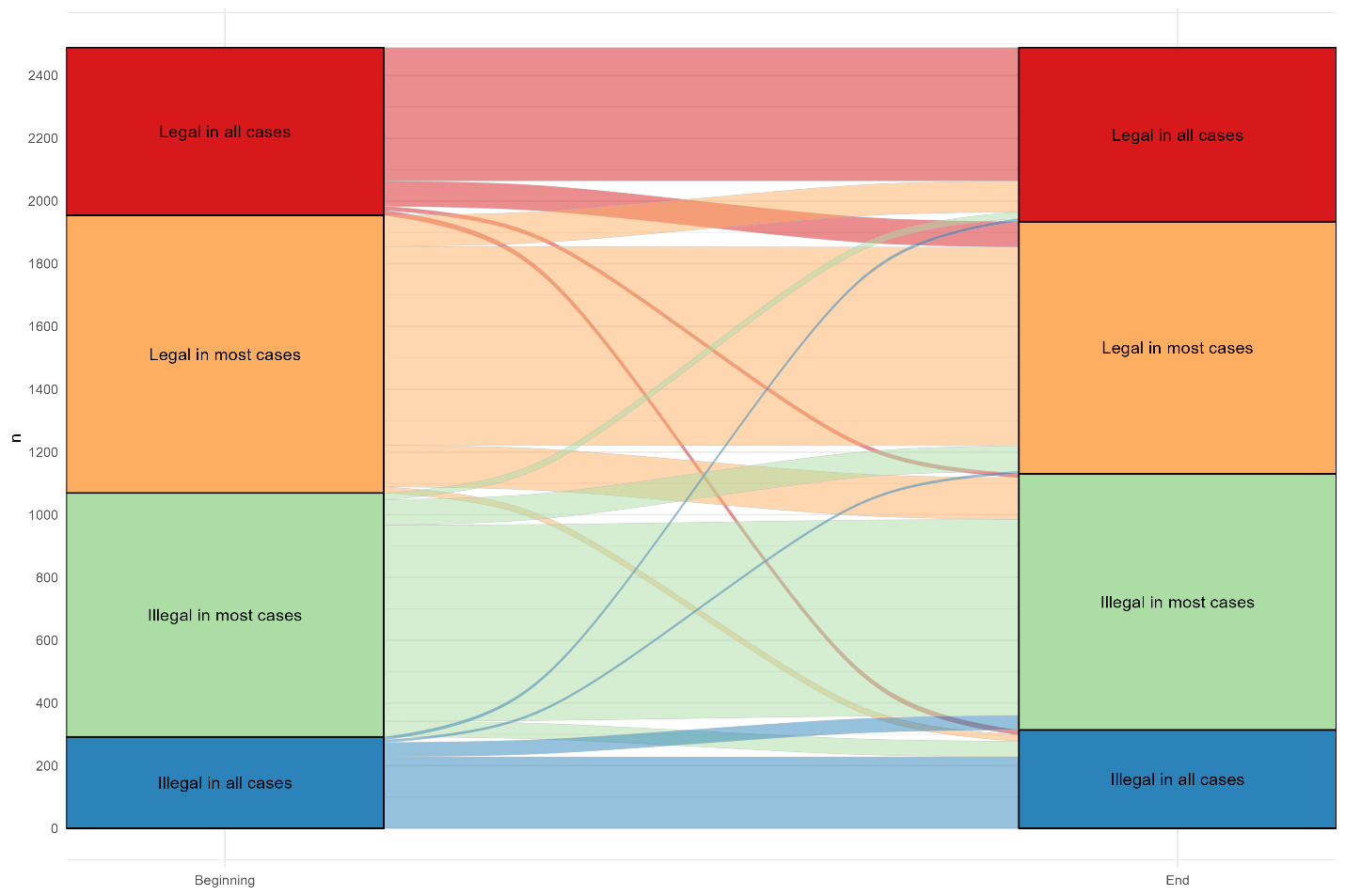 There was a significant association for direction and magnitude of change for the abortion attitude question: χ²(3) = 18.54, (p < .01). Table 1 and its alluvial plot show the distribution of responses to the abortion legality question asked at both the beginning and end of the survey. Nearly one-quarter (23.2%) changed their response, with a significantly larger percentage exhibiting more restrictive responses (12.6%) compared with more permissive shifts (10.6%; Table 2). The most stable group favored abortion being illegal in most cases (80.4%), while the least stable initially indicated abortion should be legal in most cases (71.5%). Post-hoc pairwise comparisons indicated a significant shift from “legal in most cases” to “illegal in most cases” (Table 1; χ2(1) = 12.64, p < .002), with the next largest shift being from “legal in most cases” to “illegal in all cases,” χ2(1) = 5.14, (p < .07). Importantly, category distances were not necessarily symmetrical. For example, moving from illegal in all cases to illegal in most cases is not necessarily the same magnitude as moving from legal in most cases to illegal in most cases. The direction of the differences indicates response shifts were not symmetrical, with the largest shifts occurring across legal-illegal category boundaries (15.4% shifting from legal in most cases to illegal in most cases compared with 10.4% moving in the opposite direction).