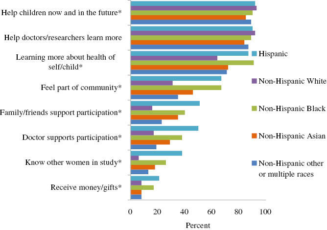 While findings indicate the majority of NCS participants joined for altruistic reasons, many of the other reasons suggest a pattern of demographic differences. We found support-related reasons (doctor and family/friends support participation, feeling part of community, knowing other women in the study) and learning more about health of self/child were important among participants who were younger, Hispanic, not married, and less educated. Other researchers have found similar demographic patterns (Daniels et al. 2006; Lamvu et al. 2005).