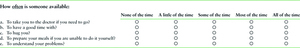 From left to right, response options were ordered from positive to negative and ranged from “not at all” (score of 1) to “extremely,” (score of 5) or “none of the time” (score of 1) to “all of the time” (score of 5). The social support grid was opposite in that from left to right its order was negative to positive, i.e., “not at all” to “nearly every day.” To maintain consistency across the grids, the social support scale was reversed in the analysis so that “nearly every day” was a score of 1 and “not at all” was a score of 5.