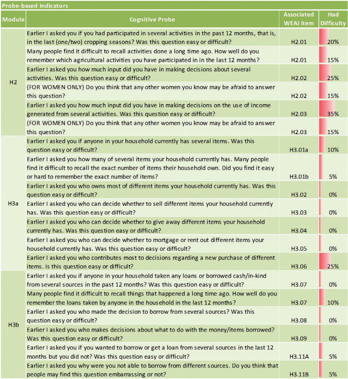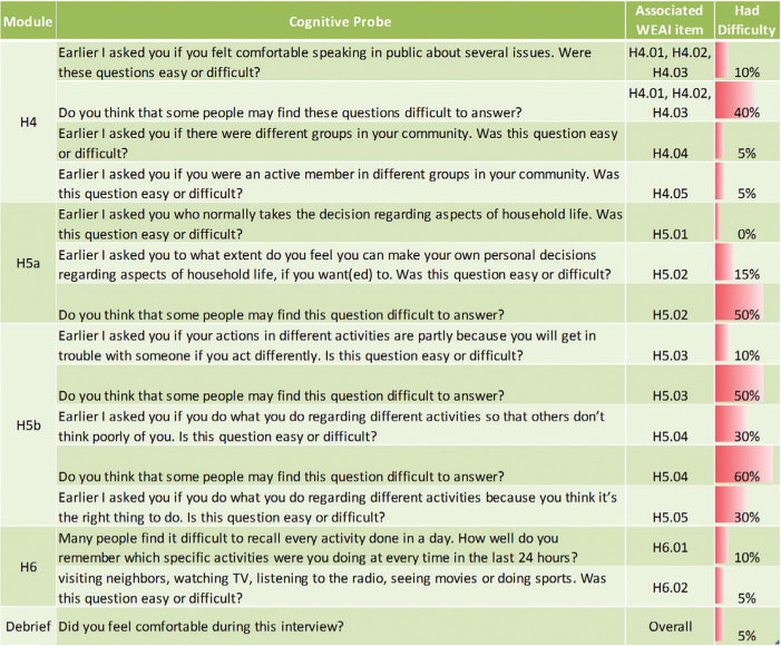 While our respondents seemed to understand most of the WEAI questionnaire as intended, several aspects of the questionnaire emerged as problematic. The results presented here highlight the more significant problems observed, organized according to the four cognitive stages involved in responding to survey questions: comprehension, retrieval, judgment, and response. We also report on the similarities and differences found between observation- and probe-based indicators of cognitive difficulty.