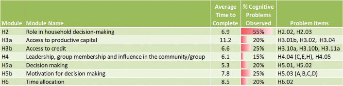 The observation-based indicators of cognitive difficulties indicate that most people had trouble with questions on roles in household decisionmaking, particularly the concept of inputs into decisionmaking (Module H2; see Figure 1). This may be a function of question-specific difficulties, or it could be related to the placement of the module at the beginning of the interview, when respondents are still acclimating to the format of the interview.