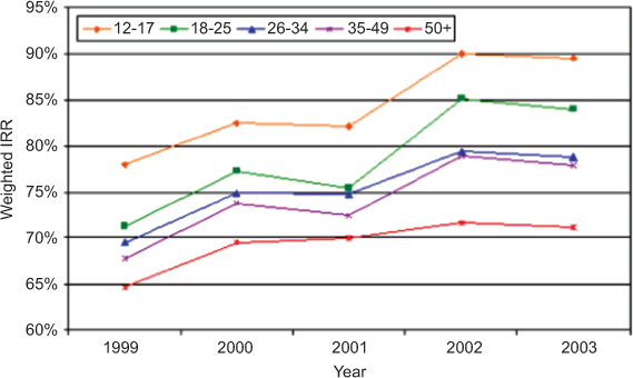 Data for NSDUH [1] are collected by field interviewers (FIs) through face-to-face interviews using CAPI (computer-assisted personal interview) and ACASI (audio computer-assisted self-interview) methodologies (Caviness et al. 2006). Figure 1 [2] shows the weighted interview response rates (AAPOR Response Rate #6) by age for the NSDUH from 1999 to 2003. Across all years, response rates were lowest for the 50+ age group. In 2001, a series of methodological enhancements were introduced to the study in order to increase response rates (SAMHSA 2003). Response rates from 2001 to 2002 were significantly higher for all age groups except the 50+ group. This suggests that the methodological changes had a larger positive effect on the response propensity of younger respondents thereby magnifying the already existing differences in response rate by age.