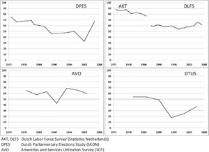 Figure 2 shows that response rates in a series of major Dutch face-to-face surveys were much higher in the past than they are today, but also that response rates have been going up again in recent years. This raises three questions. Why were response rates so high in the past? Why did they go up again? And can they be maintained at their present level?