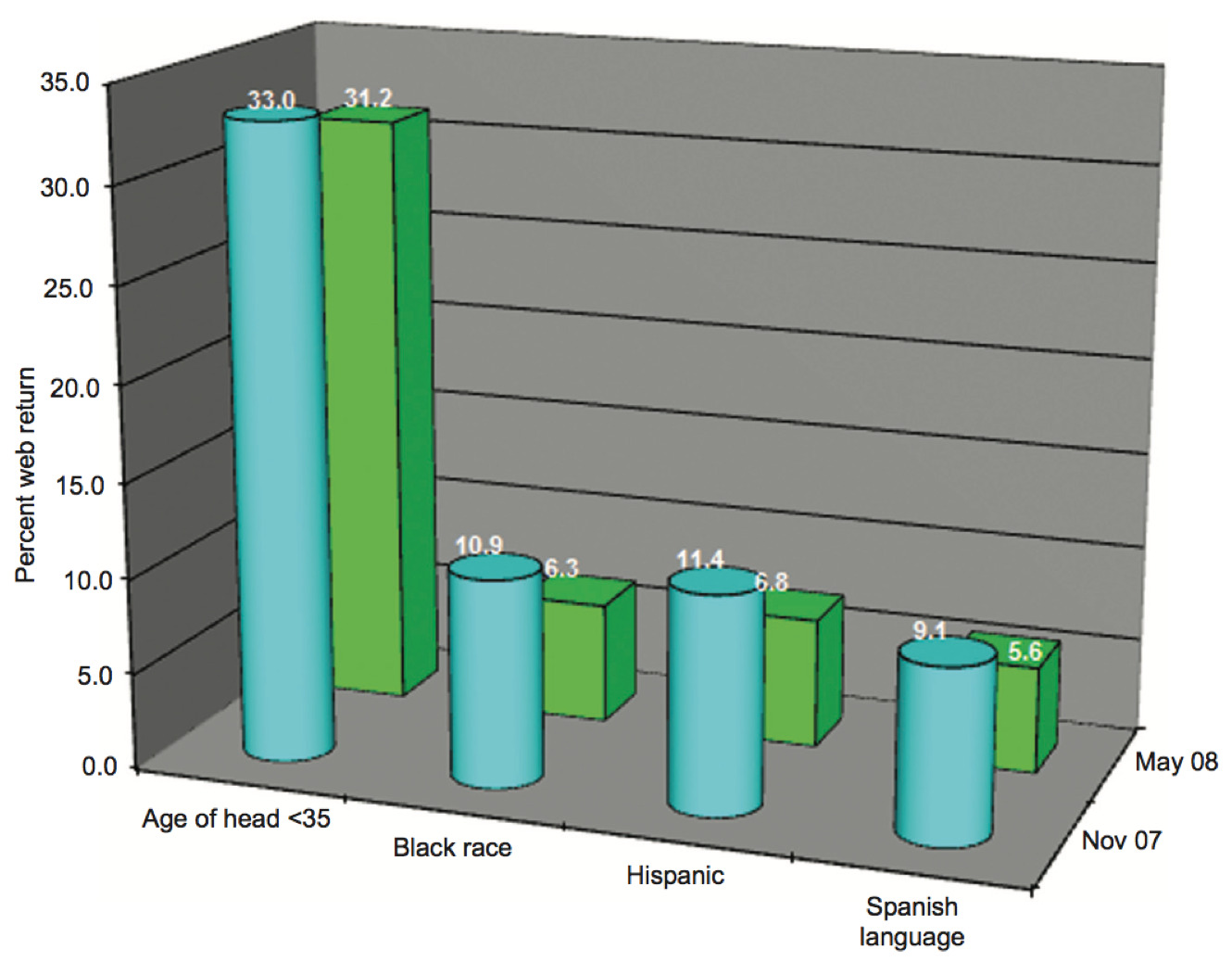 When looking at certain hard-to-reach demographics we see similar drops in return to the web mode were found between November 2007 and May 2008 across age, race, Hispanic ethnicity and Spanish language. The biggest drops were found with Black Race (4.6% drop) and Hispanic Ethnicity (also 4.6% drop).